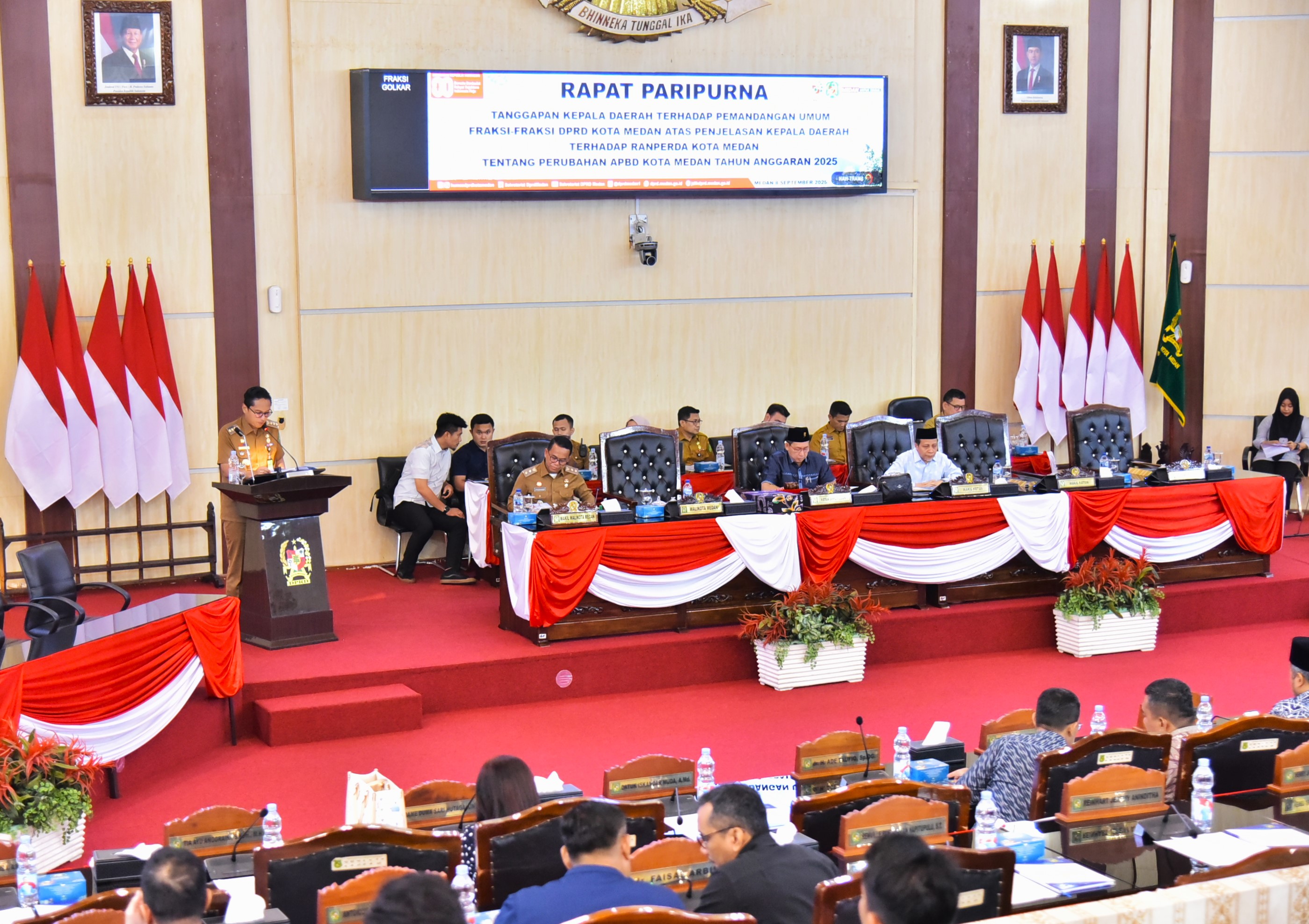 MEDAN - Kerangka anggaran Perubahan APBD Tahun 2025 harus didasarkan pada skala prioritas pembangunan kota yang telah ditetapkan. Hal ini terungkap pada Rapat Paripurna DPRD Kota Medan dalam rangka Penyampaian Tanggapan Kepala Daerah terhadap Pemandangan Umum Fraksi-Fraksi DPRD Kota Medan atas Ranperda Kota Medan tentang Perubahan APBD Kota Medan Tahun Anggaran 2025, Senin (08/09/2025).
